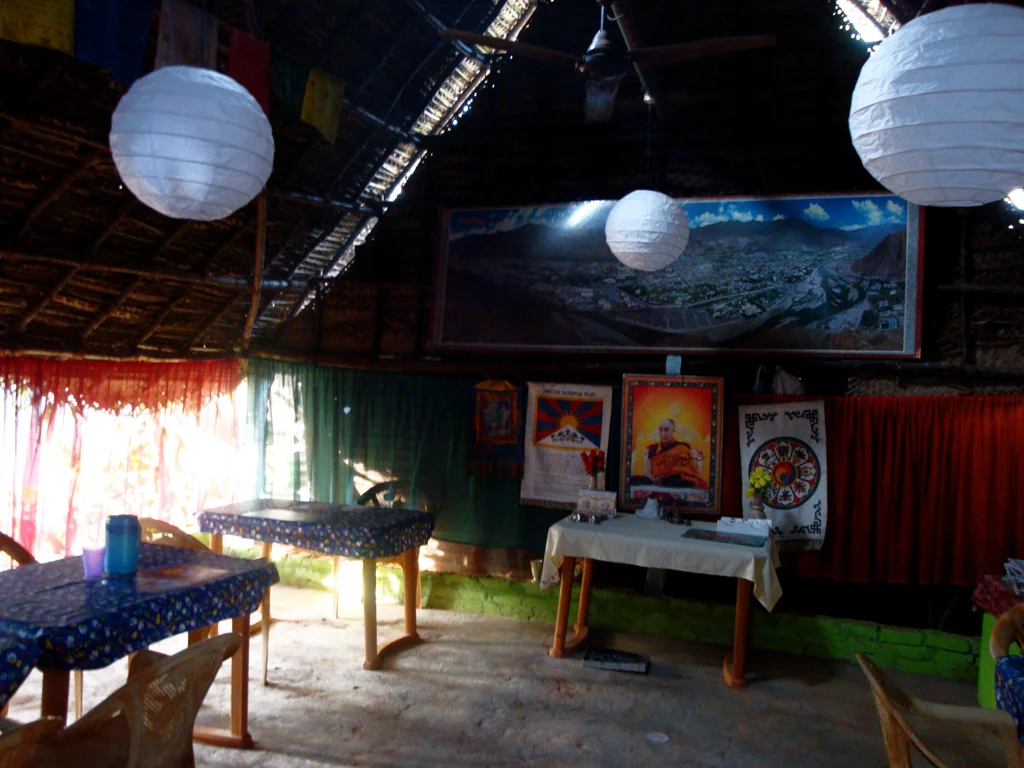 A Tibetan food place called Lhasa in Auroville was my Sunday lunch. I've really missed Tibetan food since I've come to Pondicherry. I love momo's and thukpa. Its quite easy to get in Ahmadabad because a group of nomadic Tibetan refugees travel there every winter, setting up shop for about 6 months. They sell woolens, and put up little diners next to their homes so that broke students can get a good, warm meal for 20 Rs. In Pondy, its difficult to find. The only two Tibetan places that do exist are in Auroville, which is too far from town for everyday eating. The momo's are good in Lhasa, but I don't know if they serve authentic Thukpa (noodle soup with mince meat and vegetables). A photo of the place, with a picture of the Dalai Lama framed at the center of the table: