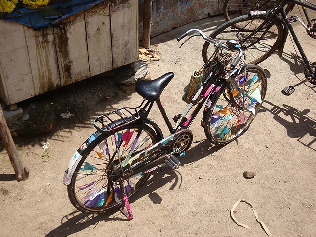 A picture of a well decorated cycle; even a week after Dussera, most of the decorations are still visible in and around Pondicherry: