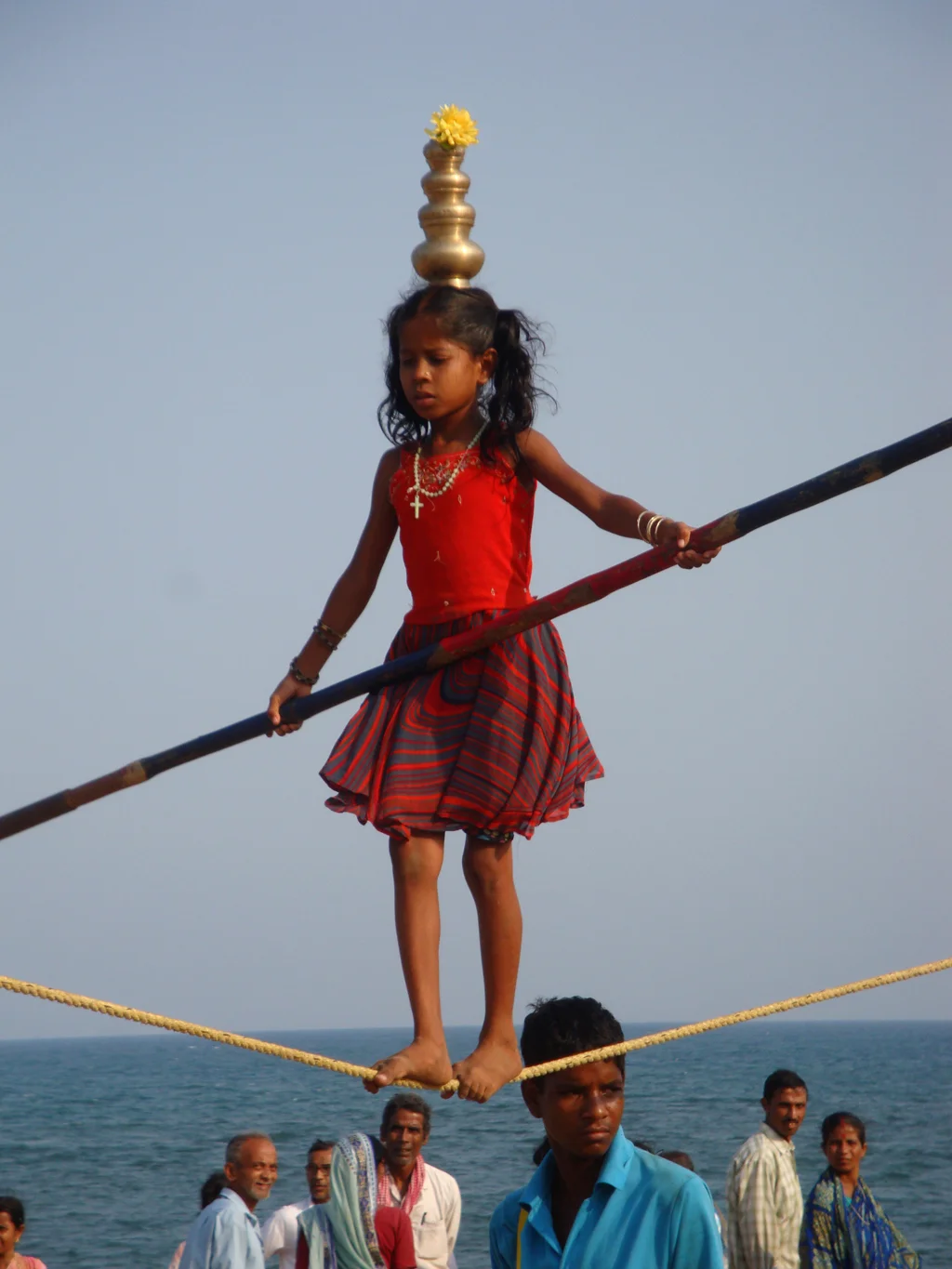A young girl walks the tightrope by the beach in Pondicherry. Her brother plays the drums to attract spectators, while her parents sit by the side, looking on and waiting for donations from tourists and passers-by.
