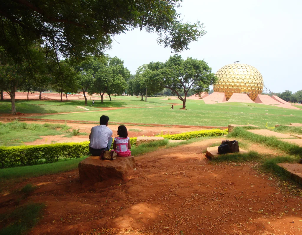 The second time we were well informed, we got there on time, watched the required videos meant to enlighten you about Matrimandir, and finally saw it. From a distance of at least 200 meters! From the viewing point, the dome is tiny, fitting between my index finger and thumb easily. Again, we felt cheated all of us, design students, dying to see it from close. At this point we gave up, of course. I made up theories about why it was so difficult, it was a cult-religious thing, so they wanted to discourage disbelieving tourists from visiting it half-heartedly, or something...